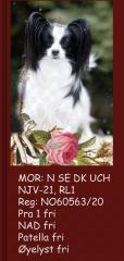 Begge foreldre er testet fri for alle arvelige øyesykdommer, (ECVO), PL testet 0/0, DNA PRA1 og DNA NAD normal gjennom arv.